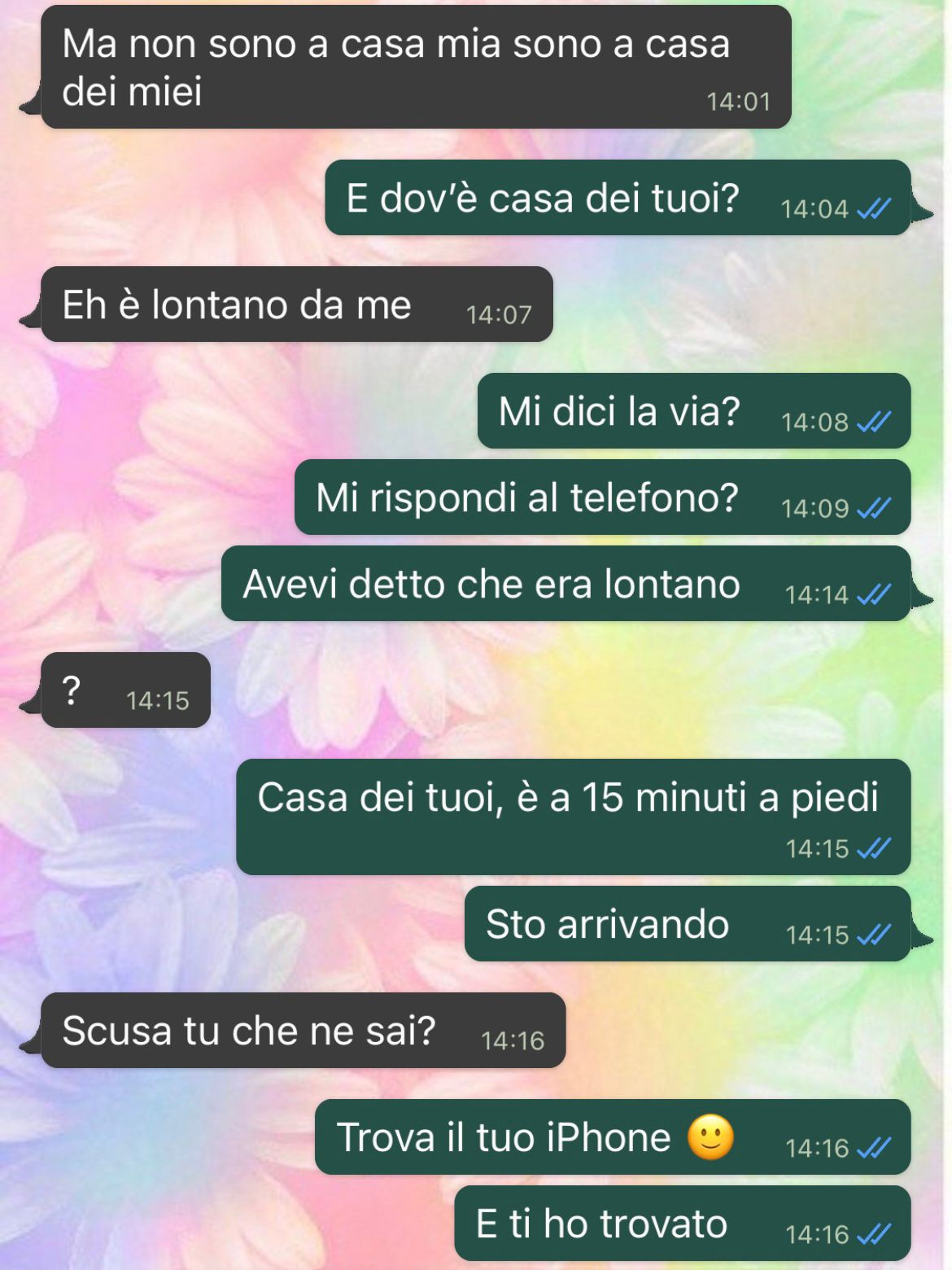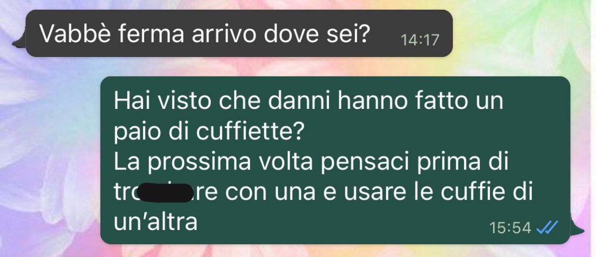 “Dopo questo ultimo messaggio, lui ha cominciato a chiamare e chiamare, dicendo che mi avrebbe raggiunta per strada perché non potevo arrivare a casa dei suoi “di soppiatto come una ladra”. Ormai però ero arrivata, e ho scoperto che il trova Iphone mi ha portato alla casa dove lui era (per davvero). Ma non era casa dei suoi, ma casa di una ragazza. Beh io non sapevo niente di lei, lei non sapeva niente di me. “