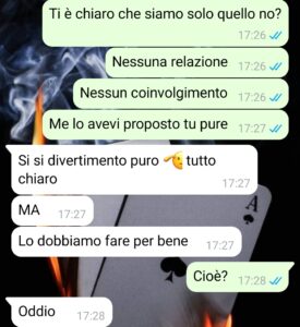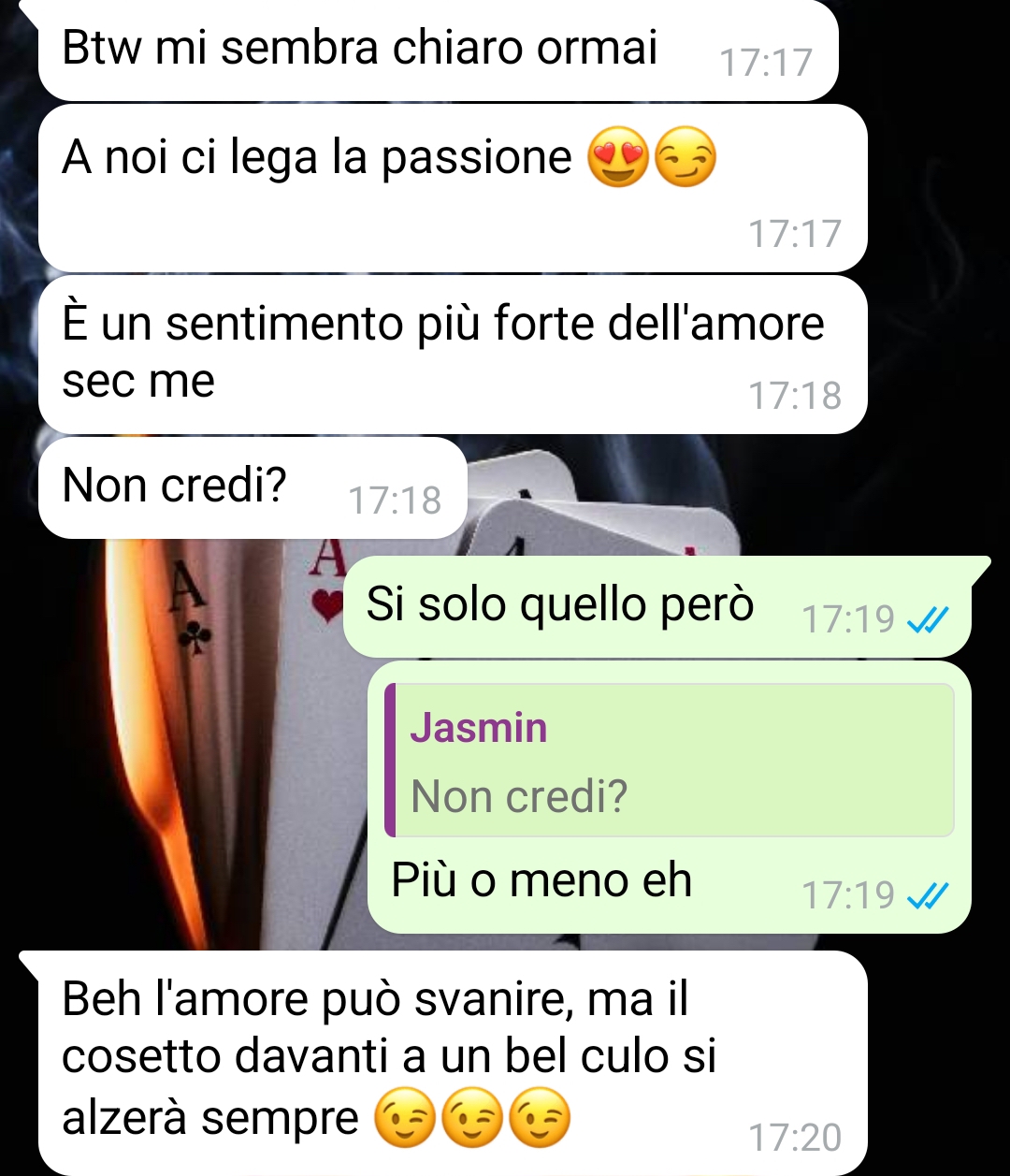 “Mi immergo anche io nel mondo di Spunteblu, inviandovi questa chat con una ragazza della mia compagnia di amici dell’università. Lo so già come andrà a finire e già vi vedo nei commenti a giudicarmi e puntare il dito per quello che ho accettato ma dopo quello che mi ha detto Jasmin secondo me passerà in secondo piano. Parto con una cosa importante: io non voglio una relazione seria. Ne ho avuta una, è andata male, stop. Ora ho altro a cui pensare quindi voglio solo divertirmi. Ma la prima a propormelo è stata proprio Jasmin, che io non conoscevo e che ho conosciuto tramite questo mio gruppo. All’inizio ero un po’ titubante perché sembrava una ragazza timida, per bene, tutto tranne che quello che si è rivelata. Va beh, ci divertiamo per un po’, con le giuste precauzioni, lei si rivela per quello che è e io ovviamente divento più freddo, lo vedete nei miei messaggi. La reputavo una ragazza intelligente almeno, invece a quanto pare mi sbagliavo su tutto. Vorrei che questa conversazione non ci fosse mai stata… Non ci si può più nemmeno divertire in pace.”