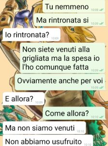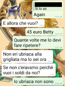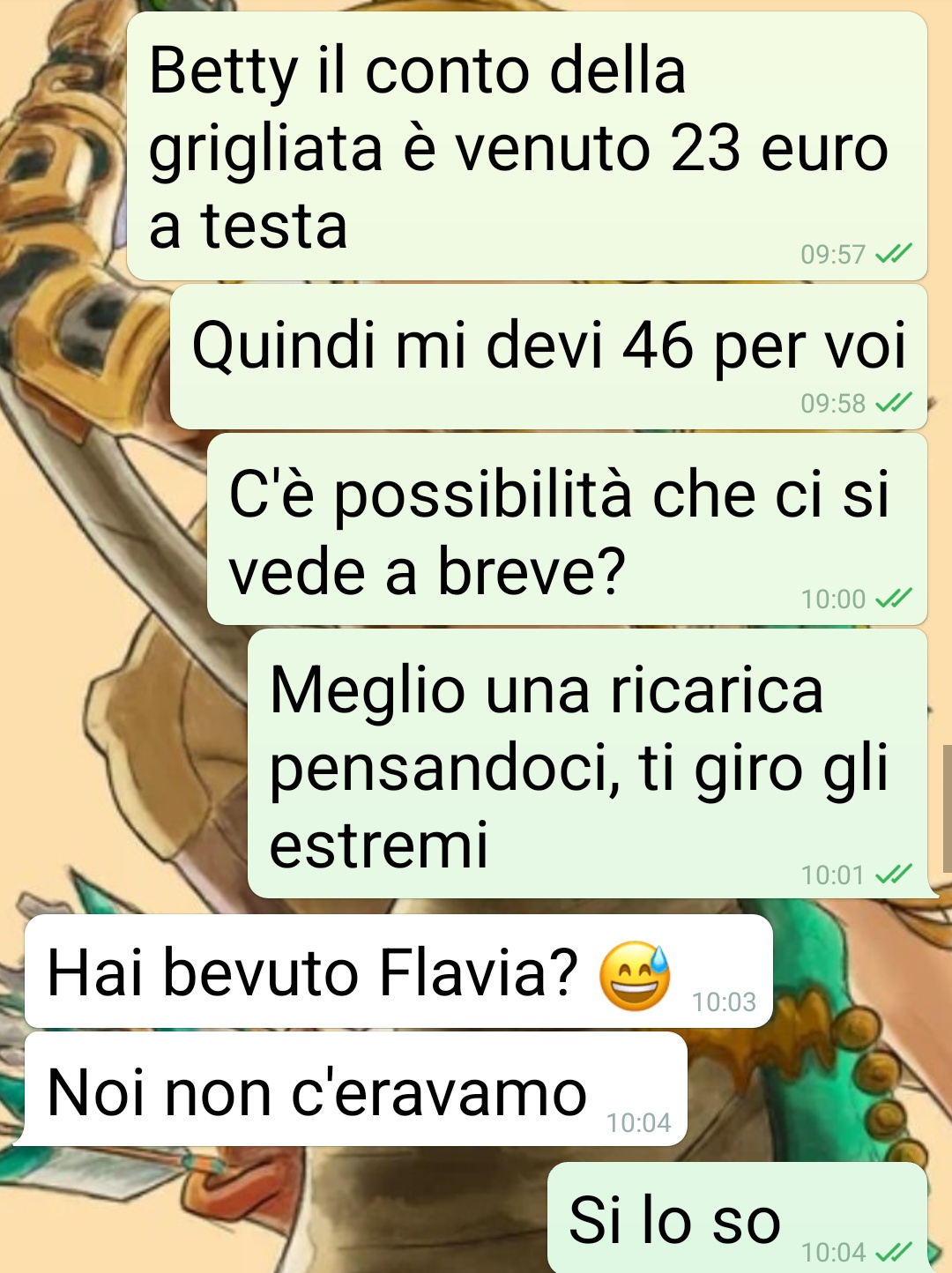 Io sono Flavia amici di spunte blu e questa è la chat con Elisabetta. Siamo amiche di vecchia data con una combriccola di una dozzina di persone. Non ci dividiamo “il giorno con la notte” come si usa dire ma ci cerchiamo regolarmente e organizziamo spesso qualcosa da fare tutti assieme. Chi non può ovviamente alla prossima. Ma Elisabetta è diventata una di quelle persone (non era così prima) che si sta impegnando per farsi odiare. E non sono la sola a pensarla così. E questa discussione secondo me rende bene l’idea. E penso segna, purtroppo, anche la fine dell’amicizia. Abbiamo organizzato una grigliata, come altre volte, in giardino da me. Siamo ormai 30enni, lavoratori, tutti fidanzati ecc. Non c’è motivo di raccogliere i soldi come alle superiori. Faccio spesa io da padrona di casa e poi si divide. Betty e il suo ragazzo hanno bidonato, e di conseguenza, a suo dire, non devono pagare la quota.”