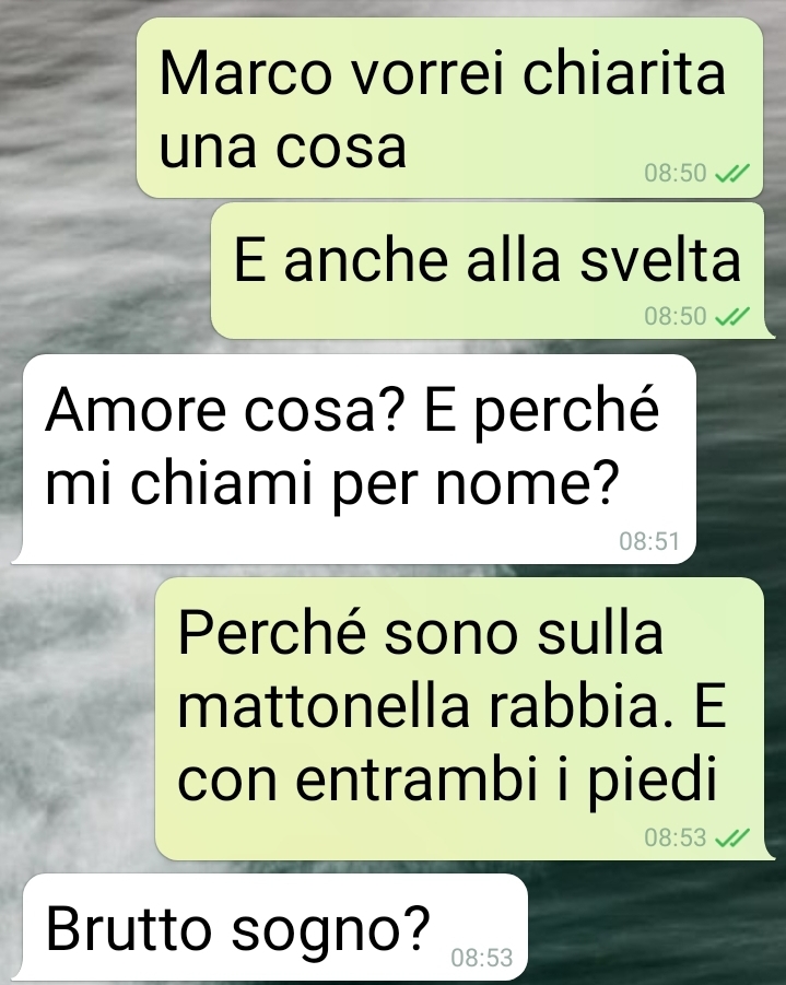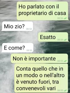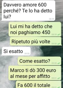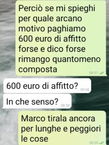 Stamattina sono libera da lavoro e voglio fare colazione al bar. Mi imbatto nel proprietario di casa, che altri non è che lo zio di Marco, il mio compagno. Sta facendo il suo giro di riscossione affitti, che possiede tutta la palazzina, ben 6 appartamenti tutti locati. E in mezzo ai convenevoli spunta che “noi”, per rispetto e parentela, paghiamo 450 invece di 600. Abbozzo, e poi subito scrivo a Marco. Ecco gli screen. Se qualcuno trova dove avrebbe ragione…”