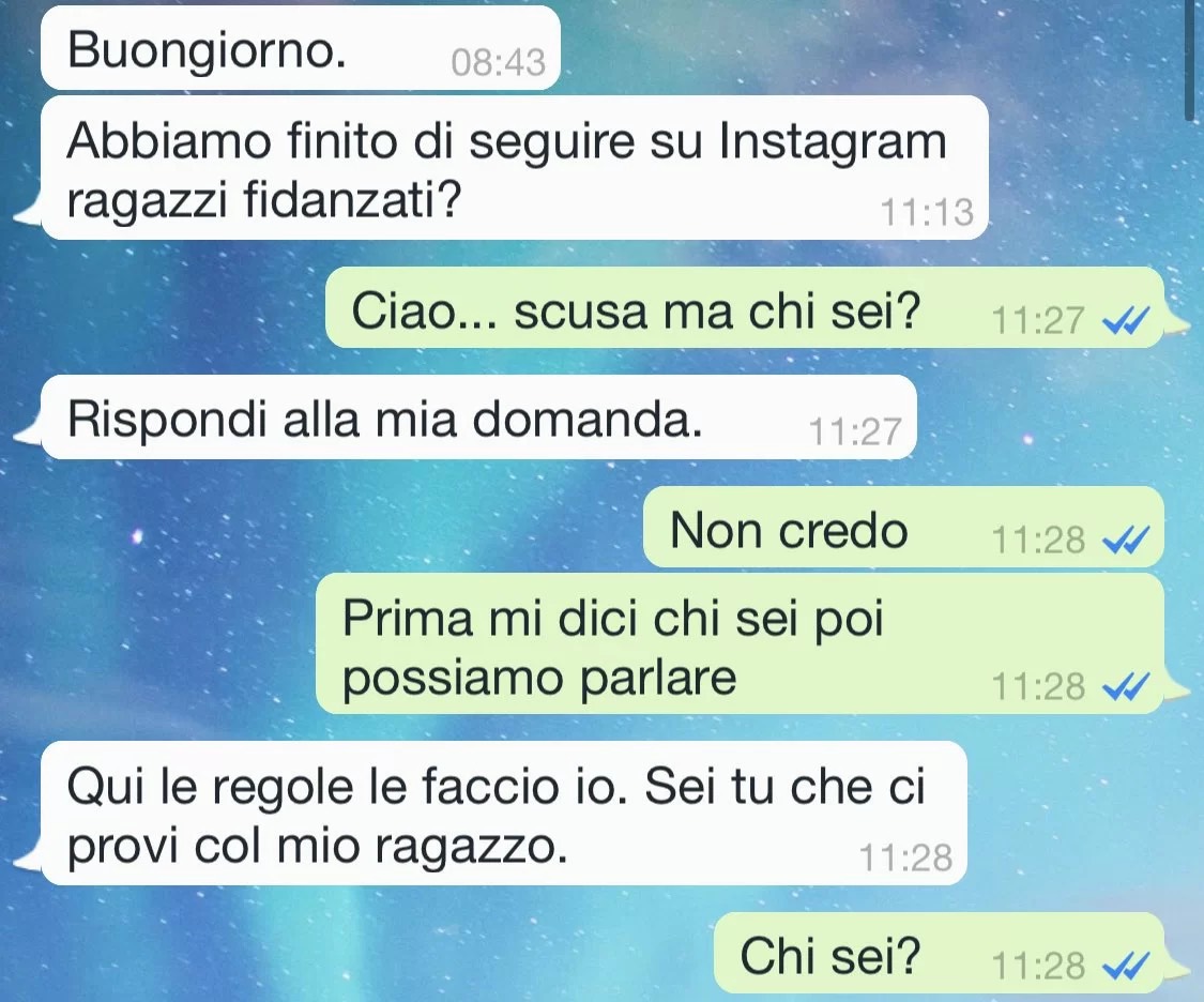 “Ciao ragazzi, vi scrivo per inviarvi i miei screen e raccontarvi quello che mi è successo pochi giorni fa… cercando però di non spoilerarvi tutto qui altrimenti vi rovinerei la lettura. In pratica improvvisamente mi scrive una tizia con fare minaccioso, dicendo che devo stare alla larga dal suo fidanzato.