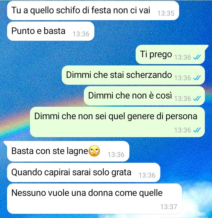 “All’epoca ero bloccata senza saperlo in una relazione possessiva e che era sfociata in una vera e propria trappola quando mi era stato impedito di andare alla festa di addio al nubilato della futura moglie di mio fratello. Senza macchina e senza soldi, mi sono ritrovata con un’unica via di uscita: andarmene e basta. Non so per quale ragione ma il mio spirito si è come ribellato a quell’idea: mi ero costruita una vita, quella casa era mia e…non avevo intenzione di rinunciare a ciò che con fatica ero riuscita a ottenere. È stato allora che ho avuto la mia illuminazione…non ero sola. Subito ho contattato le persone a me più vicine perché mi venisse data una mano ad uscire da quella situazione e, soprattutto…a non fare mai più rientrare LUI nella mia vita.