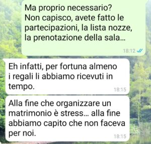 All’inizio ho pensato fosse successo qualcosa di grave. Una lite, un imprevisto, una fuga d’amore alternativa. Ma no. Nessun dramma, nessuna tragedia. Solo loro, calmi e sorridenti, che ci informavano che “alla fine abbiamo deciso di non farlo più… ma grazie ancora per il regalo, è stato utilissimo!”.