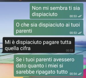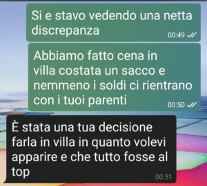 Quando ho fatto presente al mio ex marito che c’è un ammanco da saldare e che la colpa è della spocchia e della tirchieria della sua famiglia, la situazione è degenerata. Invece di prendersi le sue responsabilità, ha iniziato a tirare fuori vecchie storie di compleanni passati continuando a negare l’evidenza. Leggete i messaggi per capire fino a che punto può arrivare la faccia tosta di un uomo che preferisce far sfigurare suo figlio pur di non ammettere che la sua famiglia ha il braccino corto.”