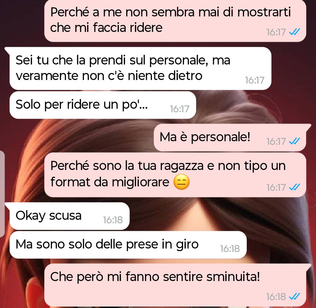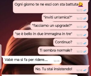 “Mi chiamo Sara, ho 32 anni e sto con Luca da quasi due. È uno di quelli simpatici, sempre pronto alla battuta, quello che “non bisogna prenderlo troppo sul serio”. All’inizio era una cosa che mi faceva impazzire di lui. Alleggeriva tutto. Anche le discussioni. Poi ha iniziato con quelle battute lì. La prima volta era una meme su Instagram: una coppia sul divano e la scritta “Quando capisci che l’amore è bello… ma in tre è meglio”. Ho riso nervosamente. Solo che non è finita. Ogni tanto tornava fuori. Una frase mentre guardavamo una serie. Una battuta su una mia amica. Un “ma tu saresti gelosa?” detto ridendo. Sempre col tono leggero. Sempre con quella scappatoia pronta: “Dai, sto scherzando”. E ogni volta io mi sentivo un filo più piccola. Perché quando la persona che ami continua a ironizzare sull’idea di “aggiungere qualcuna”, anche se lo fa ridendo, inizi a chiederti se davvero le basti stare con te. Se sei abbastanza. Se sei desiderata. O se sei solo la versione base di qualcosa che lui vorrebbe “upgrade”. Oggi mi ha mandato l’ennesima meme. E per la prima volta non mi è uscita una risata forzata. Mi è uscita la verità.
