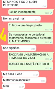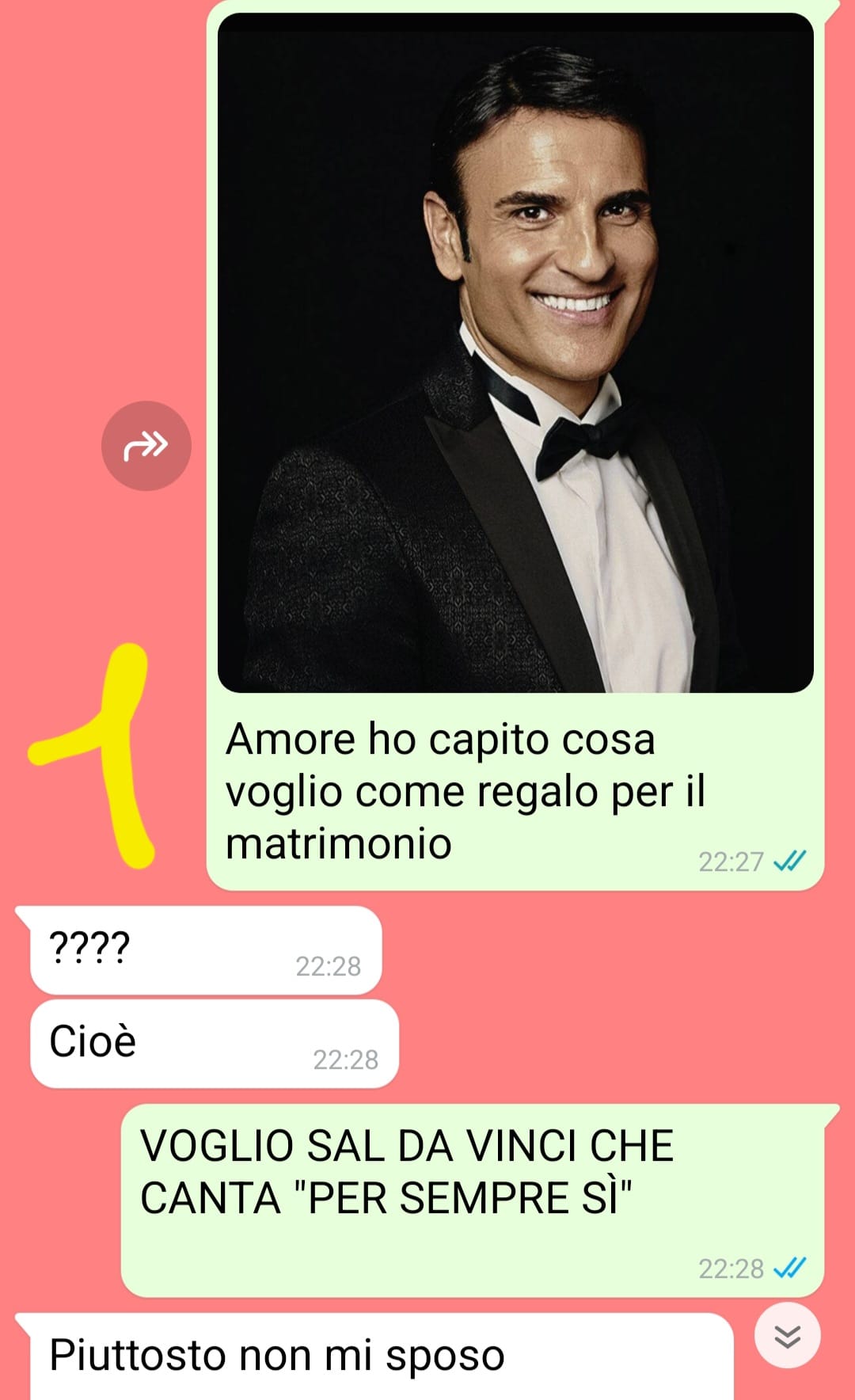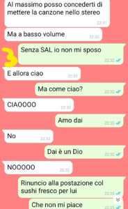 “Ciao a tutti sono una ragazza e tra pochi mesi mi sposo. Come tutte le persone che stanno per sposarsi , appena ho sentito la canzone di sua maestà Sal da Vinci io sono andata completamente fuori di testa. Erano mesi che il mio compagno mi chiedeva cosa volessi ricevere da parte sua come regalo di matrimonio…e appena ho sentito la canzone del DIVINO SAL, l’ho capito! Ho stravolto in un attimo tutte le idee che mi ero fatta per il mio matrimonio e tutto ha acquisito un senso più alto. Che senso aveva investire decine di migliaia di euro per un matrimonio come un altro? Il mio compagno mi ha sempre detto: “Come regalo di nozze puoi chiedermi qualsiasi cosa”. Bene! Io l’ho preso in parola e adesso, finchè non avrò quello che voglio, gli romperò l’anima ogni santo giorno sulle note delle canzoni del genio: SAL DA VINCI. Ci si sposa solo una volta nella vita e io ho bisogno di sapere che sarà tutto esattamente come me lo sono immaginato. Il mio compagno però non è molto d’accordo, ma io sono serissima su questo. Litigherò fino alla vittoria.”