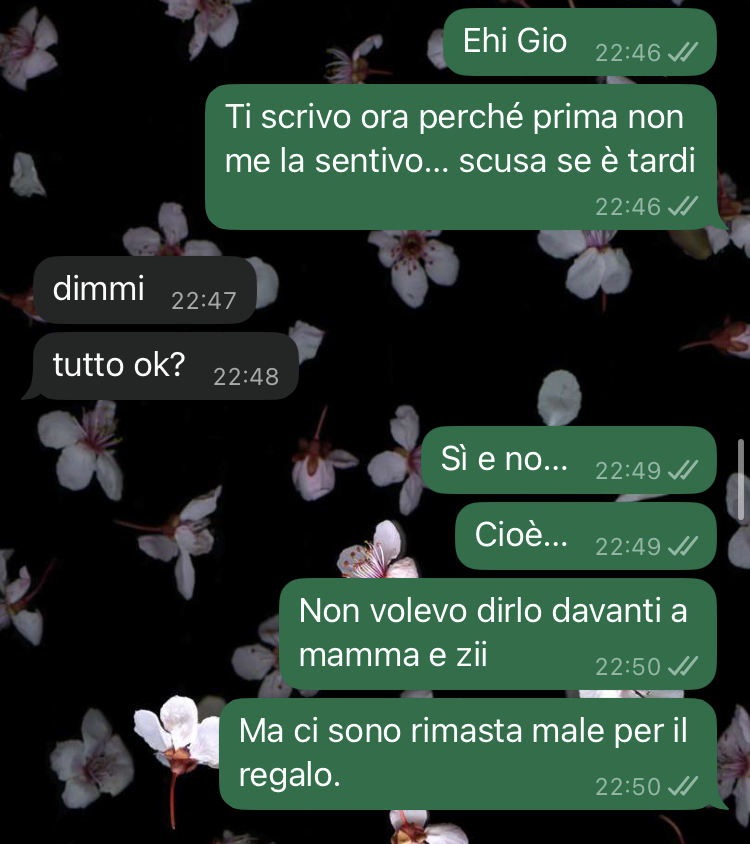 Io pensavo di sì, eh. Cioè: tavola piena, regalo sotto l’albero, clima apparentemente tranquillo. Poi però è successa una cosa orribile. Ho scartato uno dei miei regali e ci sono rimasta malissimo, anzi, malissimo è dire poco. Avevo voglia di piangere, di urlare, di scappare… ma non ho fatto niente… però ci ho pensato tutto il tempo. E la sera ho deciso di scrivere a mia sorella e affrontarla. Non poteva passarla liscia.