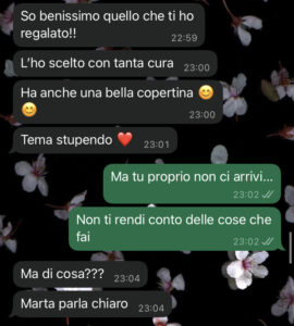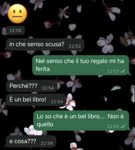 Lei ovviamente non si era accorta di niente perché avevo mascherato benissimo la mia delusione. Insomma, le ho scritto e lei ovviamente ha reagito malissimo, prima mentendomi e poi confessando la verità. Io mi sento davvero triste sinceramente. A questo punto mi vien da dire che il Natale sia tutta solo una grande ipocrisia.