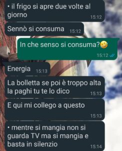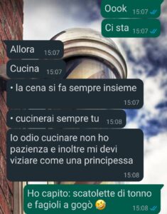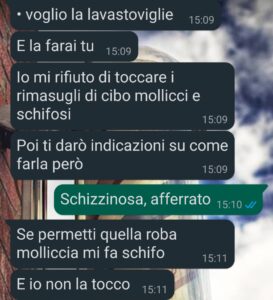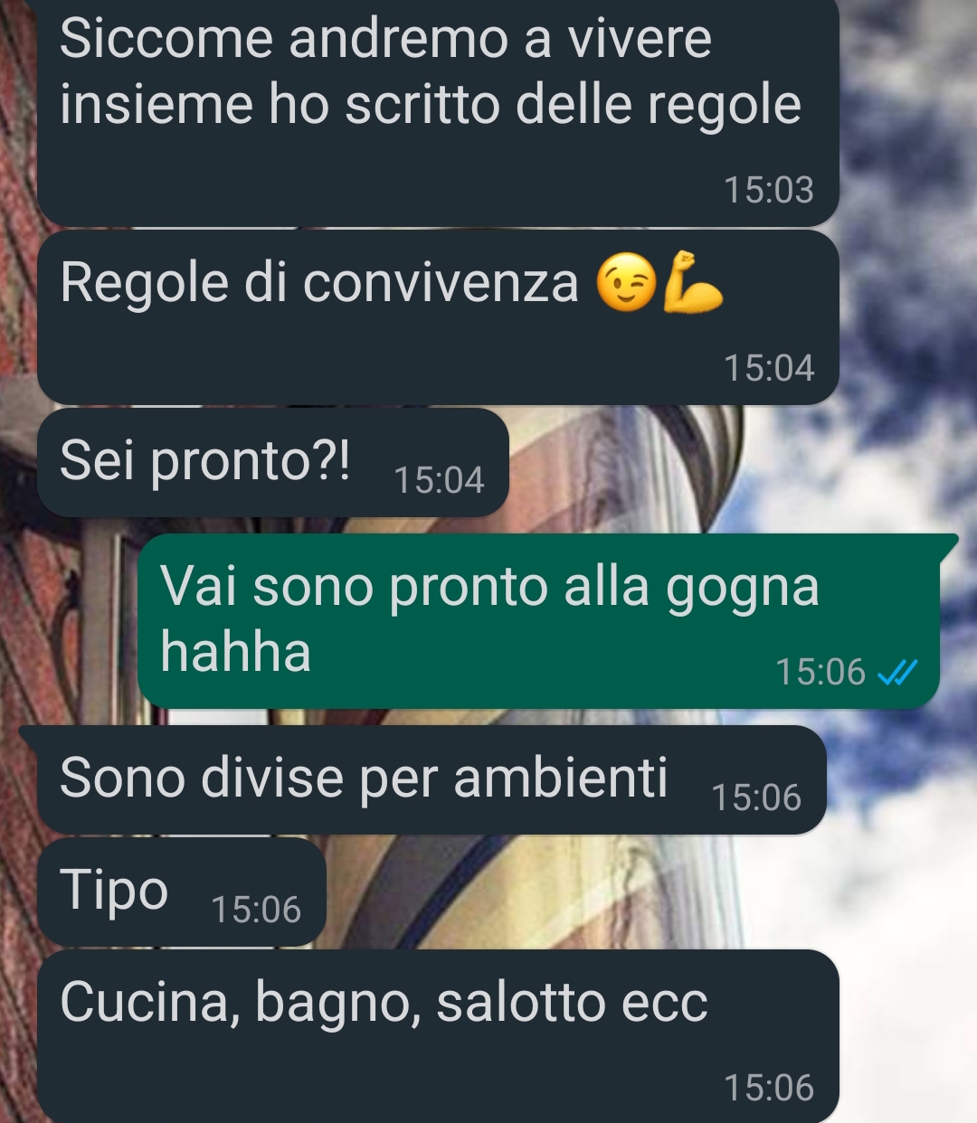 “Salve a tutto il popolo di SPUNTE BLU; mi presento, mi chiamo Robert e vi mando questi screen perché la mia ragazza (ormai ex, dopo sti messaggi) Iolanda si è inventata delle assurde regole di convivenza e me le ha elencate suddivise per zone della casa ad esempio cucina, bagno eccetera eccetera. Io non dico che delle regole non ci vogliano, ma che siano sensate almeno, che siano utili e funzionali alla convivenza, non robe fuori dal mondo. Cioè non scherzo quando dico che sono una più folle dell’altra. Sono rimasto scioccato da tutte eh sia chiaro, ma una in particolare mi ha fatto ribrezzo. E non esagero….. Vediamo se indovinate quale…. Ci sono rimasto anche perché non capisco come la gente stia messa sinceramente, ma qualcuno di normale nel mondo c’è ancora? Chiedo per un amico he… Comunque, io vi leggo sempre e se per caso pubblicherete la mia esperienza, sarò curioso di leggere i commenti della vostra community. Me li immagino già…”