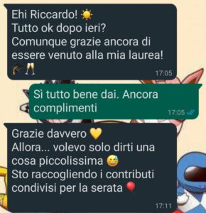 Quando mi ha invitato alla sua festa di laurea, ho pensato fosse una bella occasione. Piccola cena a casa sua, una decina di persone, clima rilassato. Si è anche mangiato bene, eh.