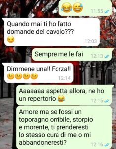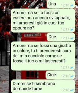 “Buonasera a tutta la community Spunte blu mi chiamo Federico e sono fidanzato a tratti felicemente con la mia ragazza che si chiama Elisa. Dico a tratti perché ci sono delle volte che mi manda in bestia… Un po’ mi innervosisco, ma per fortuna poi la maggior parte delle volte la prendo sul ridere, perché veramente è incredibile. Non so se anche a voi capita, mi rivolgo a chi ha è impegnato e ha una fidanzata, che la vostra ragazza perda un attimo il lume della ragione e vi faccia domande strane. La mia se ne esce fuori a volte con certe perle che sinceramente non capisco se se le sogna di notte o ci sono momenti in cui semplicemente dà di matto e basta. Spesso e volentieri non vorrei rispondere a queste domande fuori da ogni logica umana, ma poi lo faccio comunque per accontentarla, perché sennò chi la sente??? Ieri se ne è uscita di nuovo con un “posso farti una domanda” e stavo già sudando freddo. Speravo non fosse un’altra “baggianata” delle sue e invece è stato proprio così. Lei ha reagito malissimo alla mia risposta, ma io l’ho chiusa secondo me anche egregiamente.”