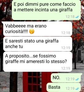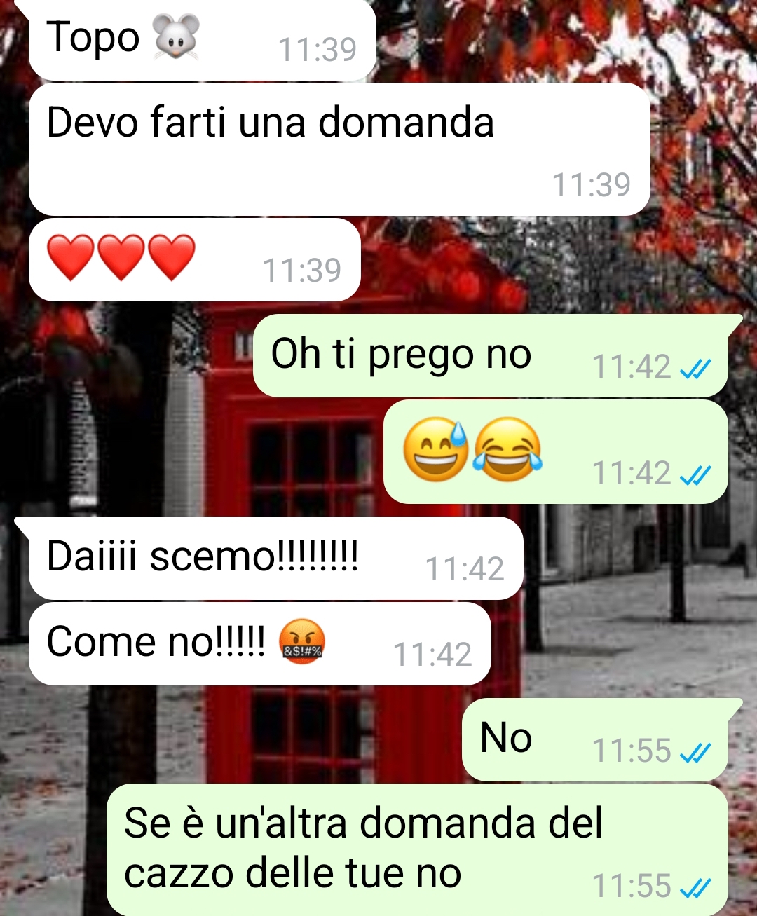 “Buonasera a tutta la community Spunte blu mi chiamo Federico e sono fidanzato a tratti felicemente con la mia ragazza che si chiama Elisa. Dico a tratti perché ci sono delle volte che mi manda in bestia… Un po’ mi innervosisco, ma per fortuna poi la maggior parte delle volte la prendo sul ridere, perché veramente è incredibile. Non so se anche a voi capita, mi rivolgo a chi ha è impegnato e ha una fidanzata, che la vostra ragazza perda un attimo il lume della ragione e vi faccia domande strane. La mia se ne esce fuori a volte con certe perle che sinceramente non capisco se se le sogna di notte o ci sono momenti in cui semplicemente dà di matto e basta. Spesso e volentieri non vorrei rispondere a queste domande fuori da ogni logica umana, ma poi lo faccio comunque per accontentarla, perché sennò chi la sente??? Ieri se ne è uscita di nuovo con un “posso farti una domanda” e stavo già sudando freddo. Speravo non fosse un’altra “baggianata” delle sue e invece è stato proprio così. Lei ha reagito malissimo alla mia risposta, ma io l’ho chiusa secondo me anche egregiamente.”