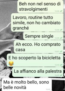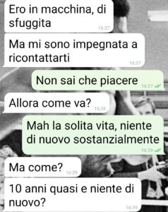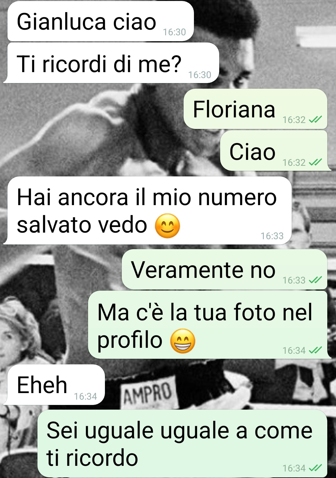 Io sono Gianluca e sono alla soglia dei 40. Nella mia vita una sola persona mi ha fatto perdere la testa, mi ha fatto innamorare seriamente. Parlo di Floriana, e succedeva più di 12 anni fa’. In realtà l’amore fu unidirezionale, perché lei al tempo mi ha sempre respinto. Con garbo e delicatezza, ma ferma. Aveva già una mezza relazione con un altro. Sono stato a provarci con discrezione per più di 2 anni, fino a quando lei non ha cambiato città, andando a convivere con quel tipo. Ho cercato di eliminarla dalla mia esistenza, e con fatica ho poi trovato un mio equilibrio. Pochi mesi fa mi ha cercato lei, per messaggio e a sorpresa. Una bella rimpatriata mi sono detto, niente di più (sapendo di mentire a me stesso), ma da un aperitivo siamo andati oltre. Forse che adesso i tempi sono maturi, nessuno dei due in fondo ha grandi novità e cambiamenti rispetto a 10 anni fa. Forse…”