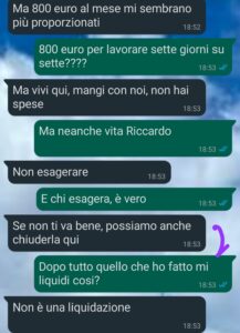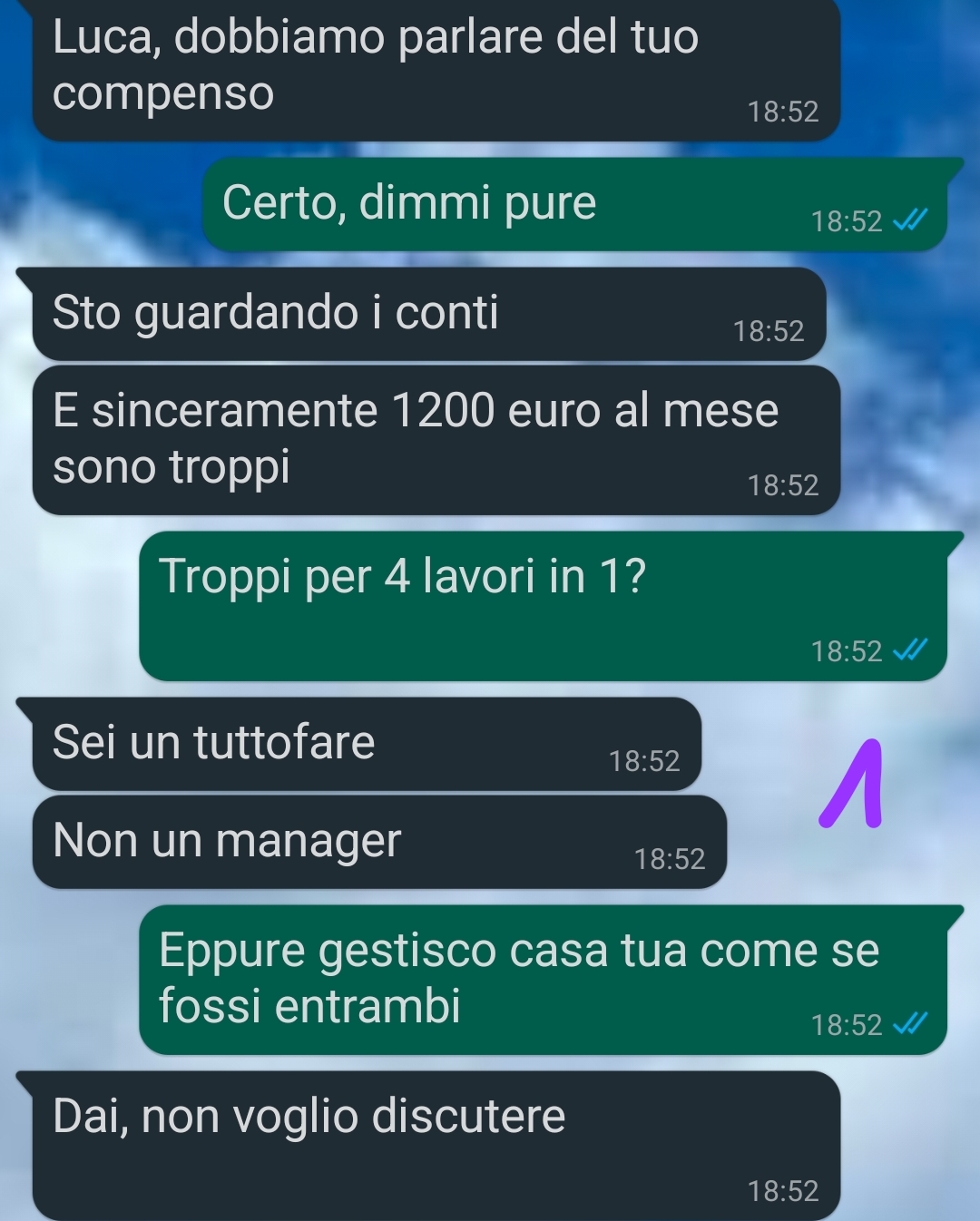 Quando mi ha chiamato per dirmi che “dovevamo rivedere la cifra”, ho capito subito che era la fine. Da 1200 euro voleva scendere a 800, perché “tanto vivevo lì e mangiavo con loro”. Come se la mia vita fosse una dipendenza e non un lavoro. Ho provato a spiegargli che non si tratta solo di soldi, ma di rispetto. Lui ha sorriso e mi ha detto che se non mi andava bene, la porta era aperta. L’ho varcata. Ma la storia, per lui, non è finita lì.”