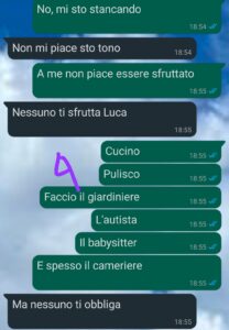 “Non c’era giorno in cui non mi chiedesse qualcosa di diverso: sistemare il giardino, accompagnare i figli, cucinare, pulire, fare la spesa, cambiare l’olio della macchina, portare fuori il cane, persino controllare la caldaia. E io lo facevo, sempre, perché pensavo che alla fine la riconoscenza valesse più di qualsiasi contratto e così ho lavorato per lui per quasi quattro anni, senza mai fermarmi, senza mai arrendermi, sempre pronto a sistemare o inventarmi modi per sembrare di essere capace e pensare di essere piu vicino a quella tanto attesa ricompensa. Come mi sbagliavo.