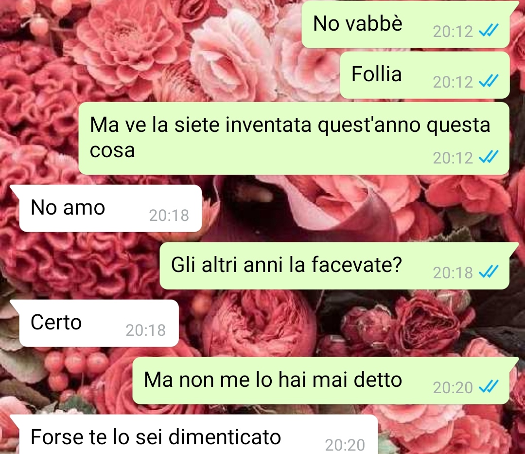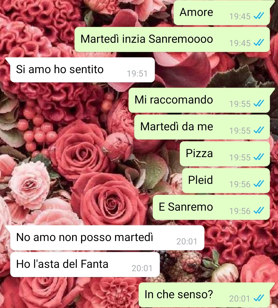 Ditemi voi come devo comportarmi perché non so più che fare non so come gestire tutti questi no che ricevo costantemente ad ogni mia proposta e richiesta, di qualsiasi tipo, anche una proposta innocente e simpatica come questa di vedere Sanremo insieme, io non capisco.”.