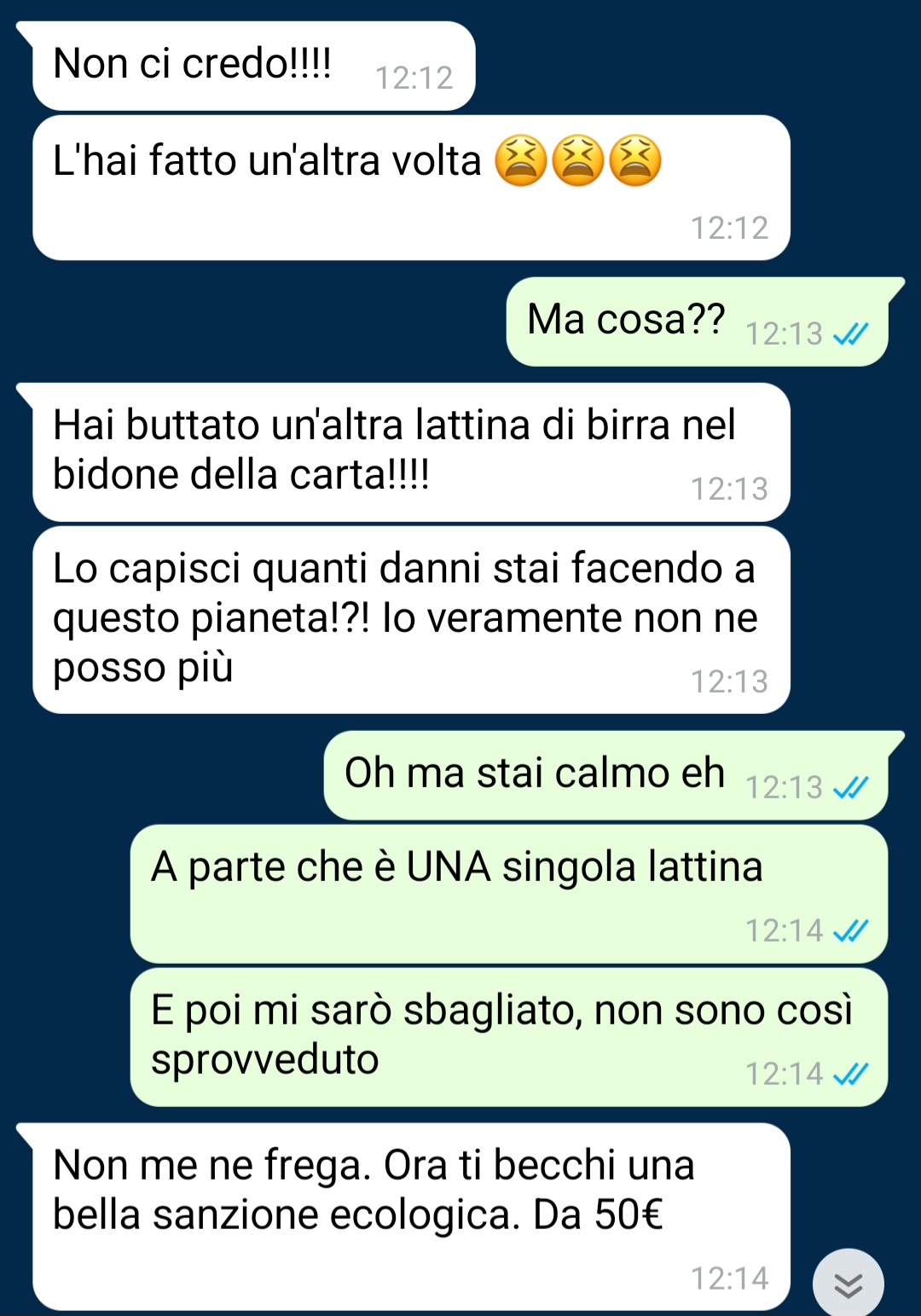 “Lo so anch’io che dovremmo impegnarci tutt* per rispettare l’ambiente. Non serve che qualcun* ce lo ripeta ogni giorno: è ovvio che differenziare, riciclare, ridurre gli sprechi sia importante. Ma siamo sincer*… in questa società è quasi impossibile essere perfett* al 100%. La vita corre, il lavoro stressa, mille impegni si accavallano, e a volte capita di sbagliare: butti la lattina nel bidone sbagliato, ti scordi la luce accesa, ordini da asporto perché non hai tempo di cucinare. Non è la fine del mondo, è la normalità di chi cerca di fare il meglio che può. Quello che non riesco proprio a digerire, invece, sono le persone che si ergono a paladine dell’ecologia solo per giudicare le altre, come se loro fossero esseri immacolati, perfetti, senza contraddizioni. Gente che fa la morale a tutt*, ma che in realtà combina pasticci molto più gravi. Avevo bisogno di un coinquilino qualche mese fa, ho fatto un annuncio e si è presentato lui. All’inizio sembrava simpatico, normale, e lo scelt*. Non l’avessi mai fatto. Me ne pento ogni singolo giorno.”