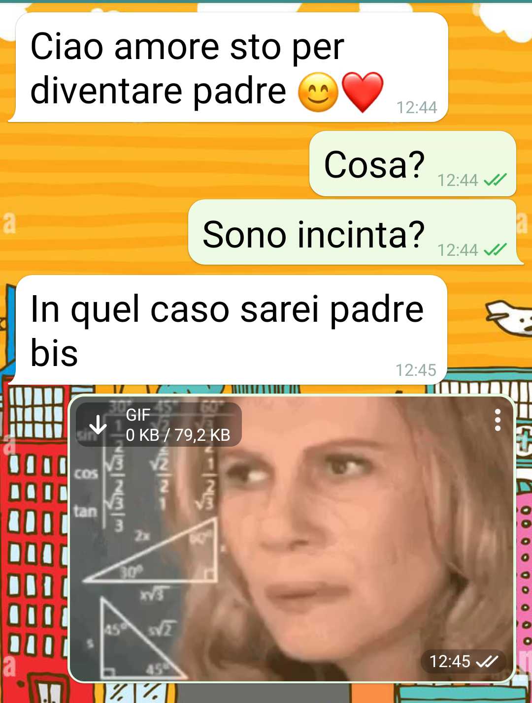 Ho un ragazzo da qualche mese e quello ora sta per diventare padre, così dal nulla. Cioè mi ha scritto per dirmi che sarà padre. Ma io non sono incinta, quindi di chi caz* diventa padre?? Indovinate un pò.