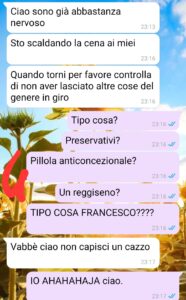 “Buongiorno Spunte blu, mi chiamo Camilla, ho 28 anni e convivo con Francesco da 1 anno e mezzo. Ci siamo conosciuti in vacanza e poi, dopo un periodo di relazione vissuta a distanza, Francesco si è trasferito nella mia città, dove abbiamo affittato una casa insieme. Io lavoro su turni, mentre Francesco lavora in una pizzeria. La sera in cui è avvenuta questa conversazione, io ero a lavoro e Francesco era andato a prendere i suoi genitori alla stazione subito dopo aver finito il suo turno. Loro vengono a trovarci ogni due, tre mesi.