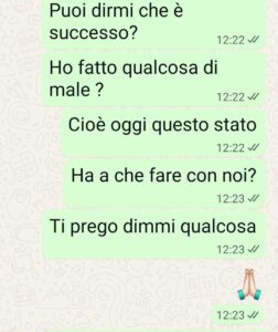 Nnon ci sto capendo niente. Non capisco cosa sia successo al mio ragazzo. È inc***?’ ho fatto qualcosa?? Si è infastidito??? Sta male?? Non ci capisco niente di niente. Vivo attraverso i suoi stati di whatsapp. Ormai è diventata una ossessione per me…. non so che sta succedendo. Da una settimana non mi risponde più. Eppure andava tutto bene… non mi ha mai detto niente— certo abbiamo litigato qualche volta ma niente di che. Mi ha sempre detto che andava tutto bene. Cioe alla fine dopo che litigavamo mi diceva che era tutto ok, che non c’era nessun problema. E ora questo… da una settimana. Niente … gli scirvo e niente… lo chiamo e niente… non so che gli è successo.