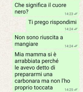sto male… ho letto online sta cosa del banksying… cioè che uno lancia messaggi in codice. Io ci sto provando a raggiungerlo, a raggiungere il suo cuore, a trovare la chiave per risolvere questo enigma. Forse è un gioco e io non l’ho capito, una challenge, non seguo tanto tiktok, qualcuno me lo dica se è così. io non ci sto capendo niente. E non riesco a mangiare e dormo malissimo. Tipo che salto in aria appena sto per addormentarmi come se mi esplodesse qualcosa nella pancia, qualcosa che mi fa saltare in aria. Ecco gli screen.”