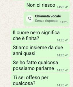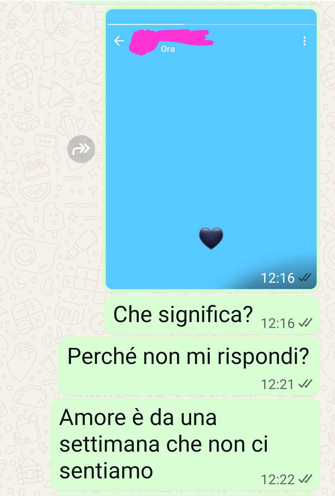 Nnon ci sto capendo niente. Non capisco cosa sia successo al mio ragazzo. È inc***?’ ho fatto qualcosa?? Si è infastidito??? Sta male?? Non ci capisco niente di niente. Vivo attraverso i suoi stati di whatsapp. Ormai è diventata una ossessione per me…. non so che sta succedendo. Da una settimana non mi risponde più. Eppure andava tutto bene… non mi ha mai detto niente— certo abbiamo litigato qualche volta ma niente di che. Mi ha sempre detto che andava tutto bene. Cioe alla fine dopo che litigavamo mi diceva che era tutto ok, che non c’era nessun problema. E ora questo… da una settimana. Niente … gli scirvo e niente… lo chiamo e niente… non so che gli è successo.