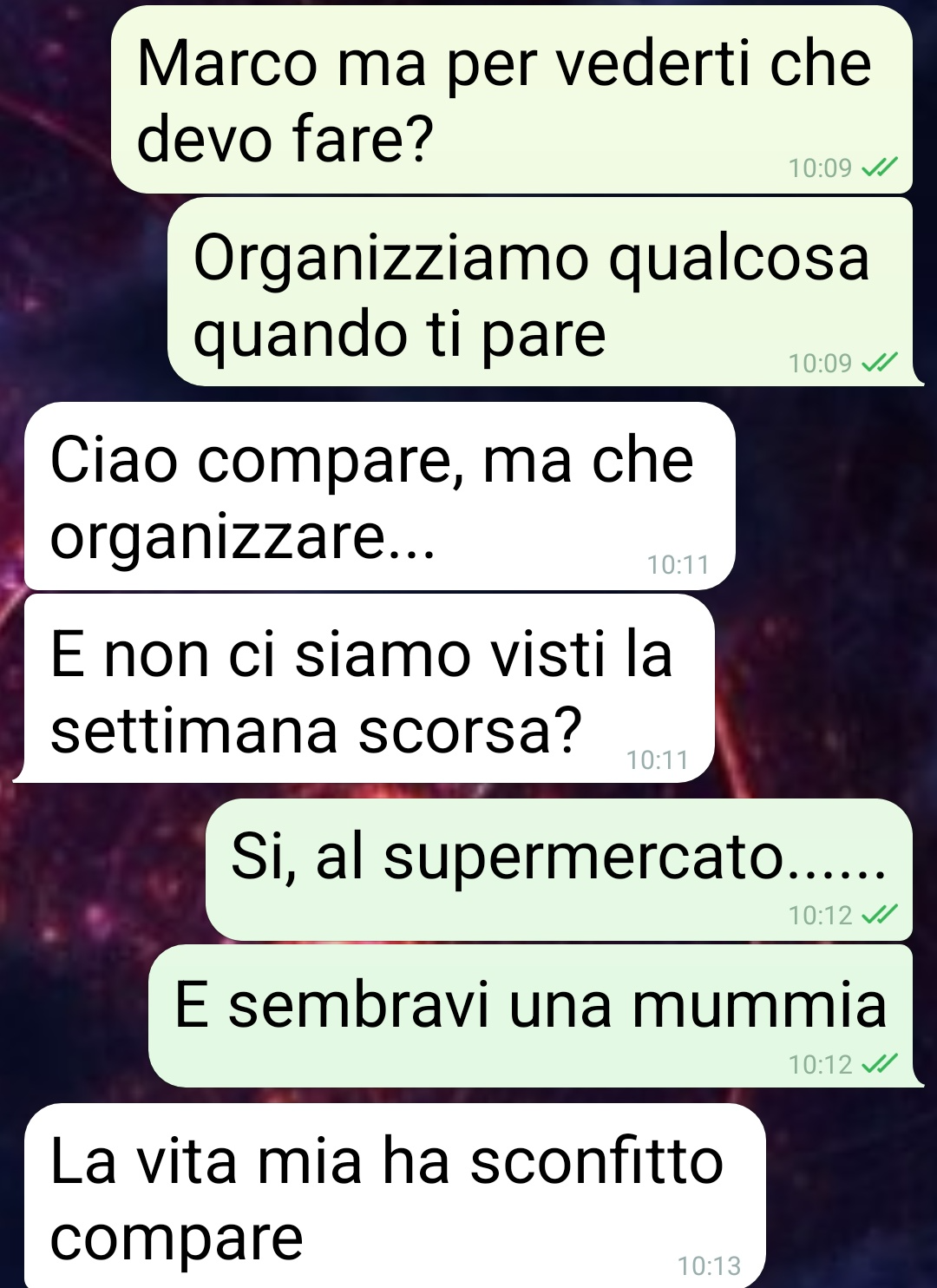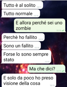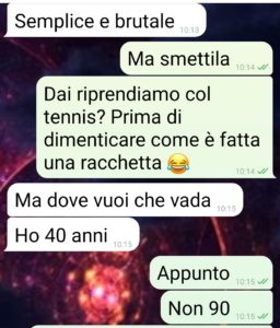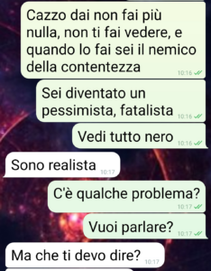 Buongiorno lettori di spunte, questa chat è tra me e il mio amico Marco. Siamo cresciuti assieme e i nostri percorsi sono praticamente stati sempre paralleli. Stesse scuole, stesse passioni – tennis su tutte – e simile percorso lavorativo e familiare. Oggi siamo due quarantenni sposati, con un figlio piccolo e un lavoro. Persone normali e che possono ritenersi fortunate. Ma lui …. in questi screen ha portato a galla una specie di tragedia. Da un paio di anni – cioè dalla nascita di suo figlio – le nostre “zingarate” si sono ovviamente e doverosamente diradate. Ma negli ultimi 3 mesi ci siamo visti solo per caso, e lui uno zombie. Un crollo totale rispetto a ciò che è sempre stato. Almeno adesso ho scoperto che cosa lo tormenta. Questa sua presa di consapevolezza, come dice. Ha ragione a dirsi sconfitto dalla vita? E io che posso fare per aiutarlo?”