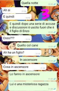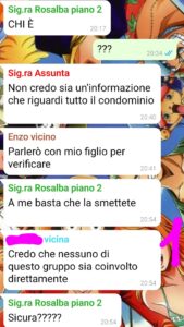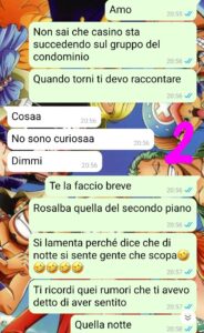 “La situazione nel palazzo si stava facendo davvero particolare ma vi confesso che appena ho capito che era coinvolto il figlio del sig. Enzo, ho pensato che fossero anche cavoli suoi e quindi ho cercato di farmi da parte per rispettare la privacy di questo signore e di suo figlio. Però non potevo tenermi tutto questo per me. Dovevo assolutamente raccontarlo alla mia ragazza, che in quel momento stava lavorando e non è nella chat nel condominio. Quindi le ho scritto un messaggio su whatsapp e le ho fatto un veloce recap della situazione pensando che lei non ne sapesse niente..invece mi ha rivelato qualcosa che non avrei mai pensato e che mi ha fatto rimanere senza parole. Pensavo fosse un condominio come un altro e invece c’erano intrecci che non avrei mai immaginato e ora dovevo anche stare attento a tenere certi segreti. Dopo poco mi ha contattato Pietro ( Ho salvato il suo contatto col punto interrogativo perché quando ho memorizzato il suo numero non ero sicuro che si chiamasse così e poi per pigrizia l’ho tenuto com’era) e mi ha confermato quello che mi aveva detto la mia ragazza. Mistero risolto, quindi? Sì, però qualcosa però non mi convinceva del tutto, avevo come una strana sensazione e dovevo liberarmene….”