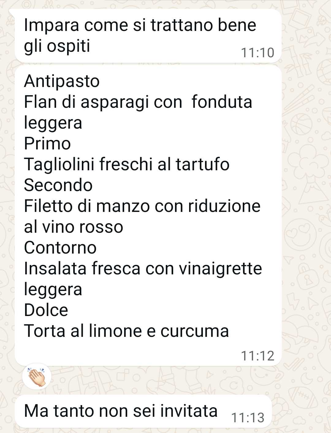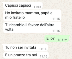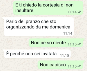 “Mia cognata ha invitato domenica a pranzo tutti, tranne me. Io che sono stata quella scortese, la guasta famiglia, quella che non sa cucinare o apparecchiare. E mi sento delusa, delusa da una famiglia che pensavo anche mia. Non sono una perfetta ma per il pranzo di pasqua ci avevo messo tutta me stessa. Tra i messaggini vari per decidere il menù, la spesa fatta in tre riprese, il dedicare una mattina alle pulizie di casa, il cucinare il giorno prima e il giorno di pasqua. Non ho delle belle tovaglie, ma è perché non faccio caso a queste cose. Per me l’importante è che il cibo sia buono e che si stia insieme. Ma questa pasqua è stata a metà. E ora mia cognata mi sta facendo pagare il prezzo di averla separata da suo fratello.