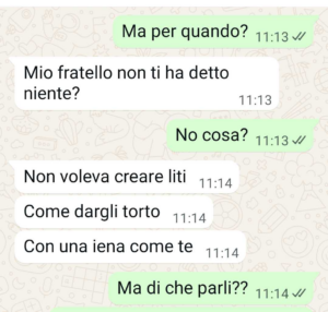 Ma io mi sento male. Mi sembra di non avere potere, di essermi scontrata con una persona cattiva, che riesce a manipolare tutti, che ha delle maniere impeccabili, che prepara pranzi all’apparenza perfetti, ma in realtà c’è il veleno. Il veleno che ci sta separando. Ma da lei ormai mi aspetto di tutto.