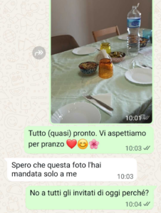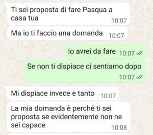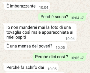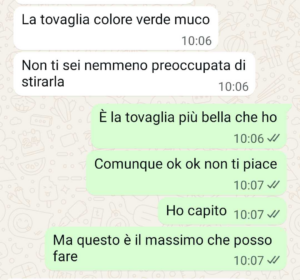 “Avevo invitato la famiglia per Pasqua da me. Ho speso un sacco di soldi, cucinato per ore, pulito la casa come mai. Mia cognata però è riuscita a rovinare tutto. E mi sento a terra. Io, mi dispiace, ma non riesco a essere perfetta. Non riesco a fare tutto benissimo. Non ho la cameriera, non ho la cuoca, non ho chi mi fa la spesa. Lavoro pure e quindi quello che faccio quando invito la famiglia a casa mia è il meglio che posso fare ma non è perfetto. Le mie scortesie per gli ospiti però non giustificano il comportamento vergognoso e cafone di mia cognata. Lei è su un altro livello ok. Ha altre passioni rispetto a me, e, non so come faccia, è super attenta a tutti i dettagli. Sono cose che io nemmeno vedo, come la tovaglia non stirata. Io non stiro, mi dispiace. Non ne ho il tempo. Penso che i vestiti si possono benissimo stirare addosso. Quanto alla tovaglia buona, mi rifiuto. Basta che è pulita. Ma figurati se mi metto per due ore con l’asse da stiro a togliere le pieghe. Ma questo non mi rende scortese. Non rende nemmeno veleno quello che cucino. Avevo fatto due teglie di lasagne, una versione strong e una versione leggera. Avevo pure le fettine di carne, oltre al rollò. Ho dovuto congelare gran parte delle cose perché mia cognata mi ha rovinato il pranzo.”