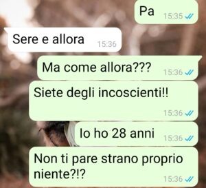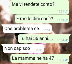 Invece, ecco che all’alba del 2 gennaio mio padre mi scrive un messaggio che quasi mi ribalto dalla sedia. Ora vi mando tutto, ma sappiate che se cercate un aggettivo con cui definire i miei, suggerisco: INCOSCIENTI ED EGOISTI. Detto ciò, mi dispiace non aver reagito nel modo migliore possibile, ma secondo me stavolta hanno esagerato.”