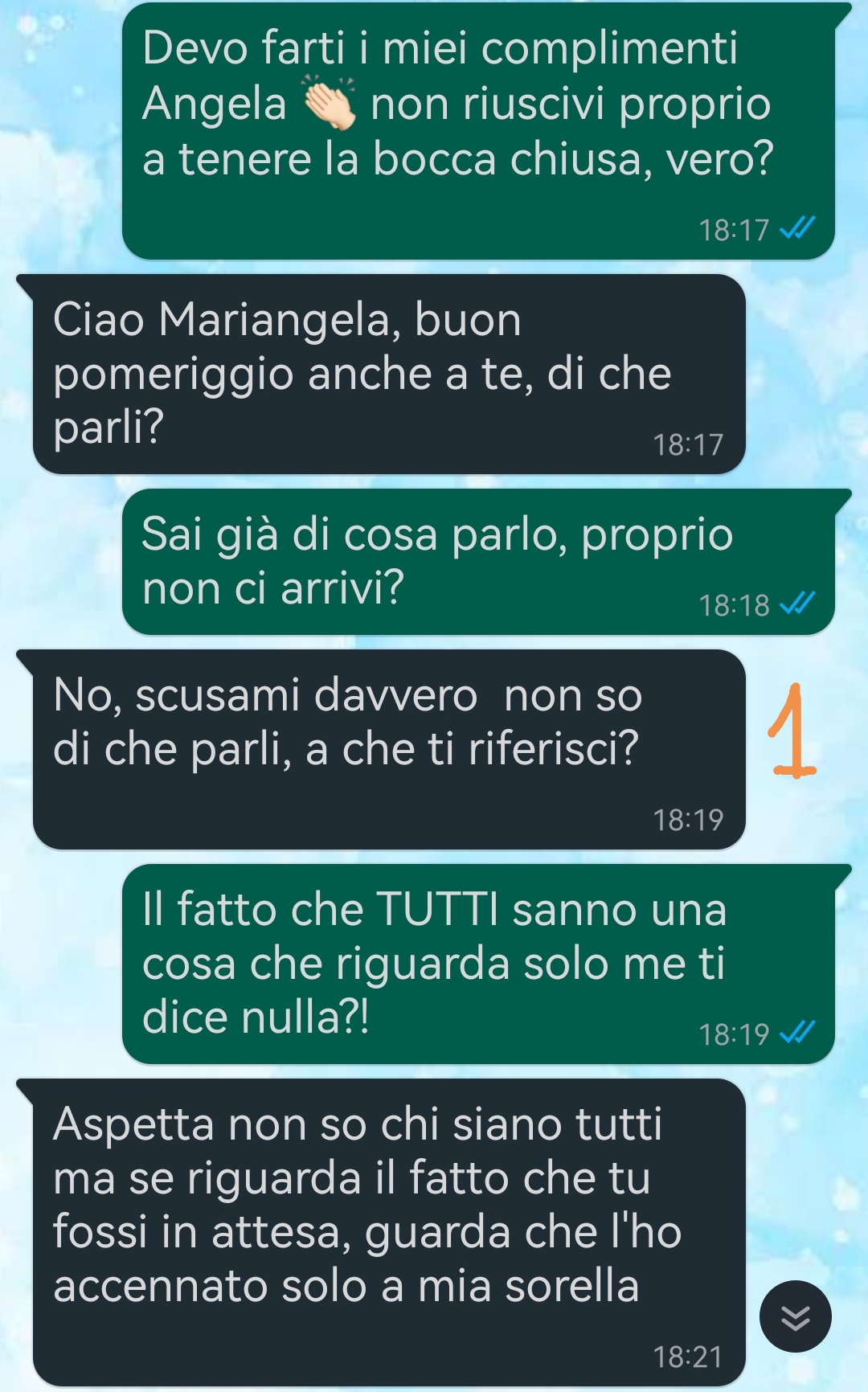 Avevo un segreto importante, una cosa che volevo tenere per me e condividere solo quando mi sarei sentita pronta. Invece, senza che le dessi alcun permesso, lei ha deciso di “anticiparmi” e raccontarlo in giro. Da lì in poi la mia vita è diventata un inferno: persone che mi fermavano, frasi di circostanza che non volevo sentire, un dolore che avrei preferito vivere in silenzio e che invece è diventato pubblico.