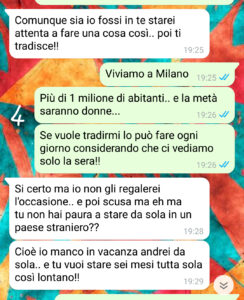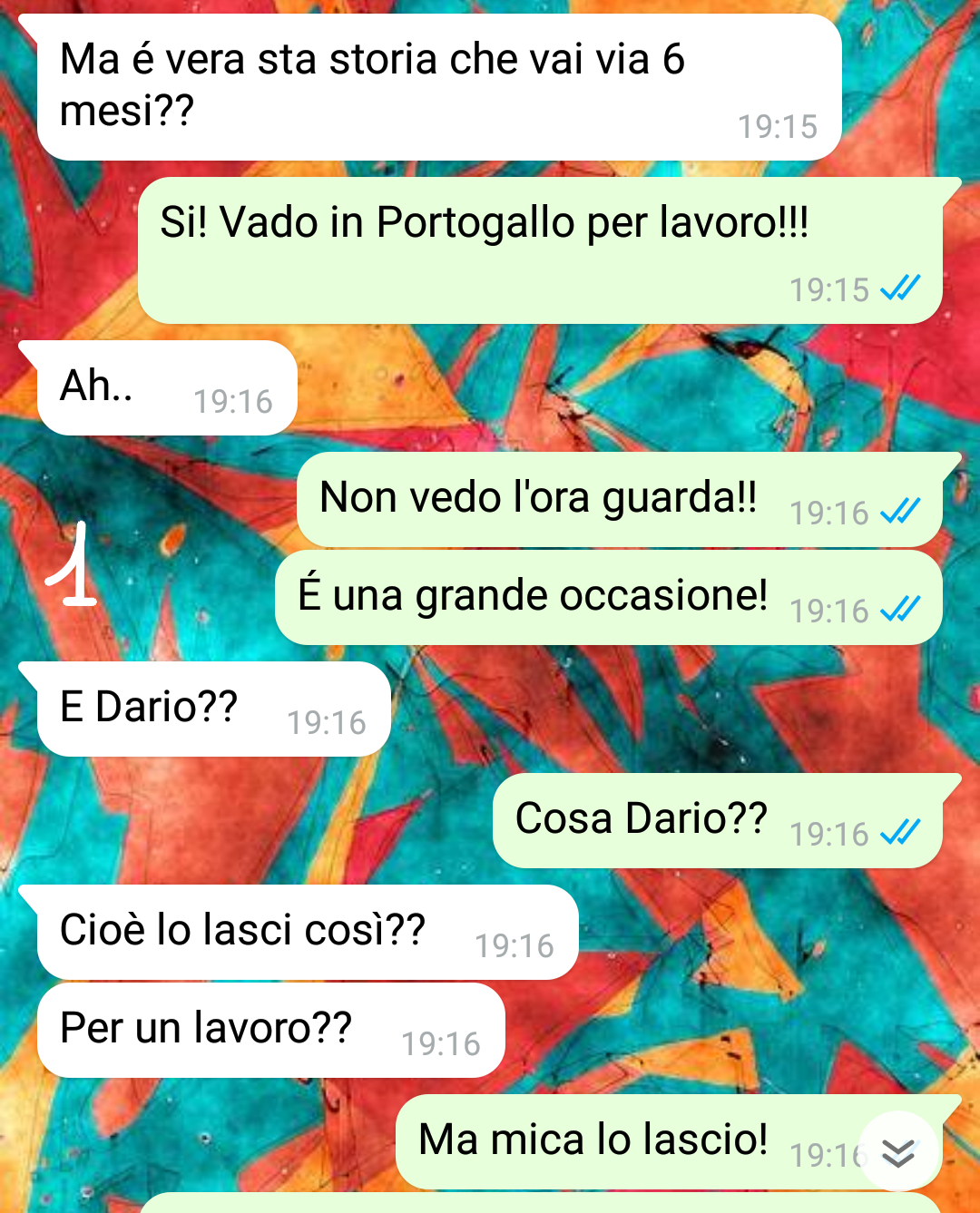 Allora io ho un marito, Dario, siamo sposati da 8 anni. Lui è meraviglioso, mi ha sempre sostenuto nel mio lavoro e devo dire che è anche grazie al suo incondizionato sostegno che ho potuto fare carriera. Dario è felicissimo di questa mia occasione lavorativa e non vede l’ora di venirmi a trovare in Portogallo! Quando però ho detto ai miei famigliari e agli amici che sarei stata via 6 mesi le reazioni non sono state del tutto positive, anzi. Molti non si capacitano di come sia possibile che io possa pensare di “mollare” mio marito e andare a vivere per tanti mesi dall’altro capo d’Europa! La più perplessa – anche se perplessa è dire poco!! – di tutti è quella che per molto tempo è stata una delle mie più care amiche: Martina, la quasi la sorella che non ho mai avuto e che oggi mi fa pensare che essere figlia unica sia stata una vera benedizione… leggete…”