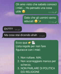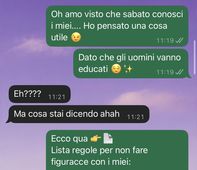 “Ciao a tutte e a tutti! Allora, sto con il mio ragazzo da un pochino e, insomma, è arrivato il momento di presentargli la mia famiglia. Il punto è che… lui, per quanto io lo adori, a volte è un po’ un orco cioè proprio spontaneo, zero filtri, dice e fa le cose come gli vengono.