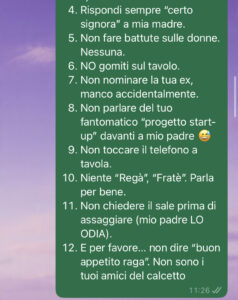 Sono super altolocati, molto attenti all’educazione, al galateo, alle buone maniere e a tutta quella roba lì che ti fa sentire come se fossi a un pranzo reale anche solo per un caffè… però non ci posso fare niente, sono così.