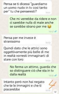 “A volte una frase detta al momento sbagliato ti resta in testa più del dovuto. Eravamo sul divano, tv accesa in sottofondo, e lui all’improvviso mi ha chiesto: “Ma sarebbe così grave se una volta guardassimo qualcosa di sconcio mentre lo facciamo?”.