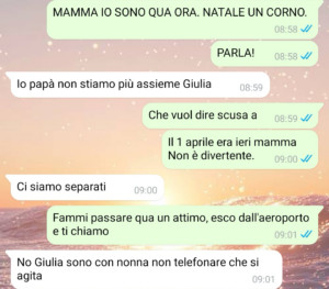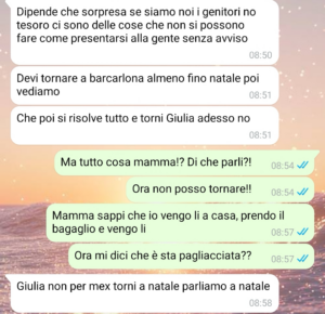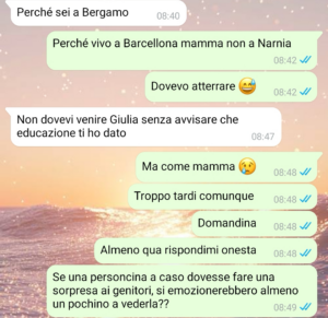 “Amici di Spunte, mi chiamo Giulia. Mi sono trasferita in Spagna circa un anno fa per lavoro e, da allora, tornare in Italia è stato molto più complicato di quanto pensassi. Un po’ per i soldi, un po’ per i ritmi assurdi, un po’ perché ogni volta che proponevo di scendere per qualche giorno i miei minimizzavano sempre: “Ma no amore, tranquilla… ci vediamo più avanti”. Così, tra una cosa e l’altra, sono passati mesi. Alla fine però, con l’arrivo della Pasqua, ho deciso di fare di testa mia: prendere un volo, non dire niente a nessuno e presentarmi direttamente a casa per fare una sorpresa. Nella mia testa era tutto già scritto: la faccia di mia madre, mio padre che finge di non emozionarsi, il pranzo, il caos, le solite battute. Quando atterro, accendo il telefono convinta di essere io quella con l’asso nella manica e scrivo a mia madre… invece mi ritrovo in una conversazione che ha preso una piega completamente diversa da quella che immaginavo. E la cosa più assurda è che, fino a quel momento, io ero convinta che a casa fosse tutto assolutamente normale. Mi sa che la sorpresa l’hanno fatta loro a me.”