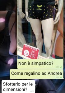 Ho conosciuto Andrea su tinder, e dato che c’è stato feeling ci siamo scambiati quindi i contatti. E per un bel po’ di tempo siamo andati avanti tra chat, messaggi, chiamate e videochiamate. Problemi di lavoro e impedimenti vari (miei) ci hanno fatto incontrare di presenza solo due settimane fa. Ma tutto è filato liscio, come abbastanza ovvio e prevedibile, vista la corposa conoscenza non canonica precedente. Al nostro terzo incontro abbiamo pure beccato la mia amica Silvia (Elvira in realtà, ma non le piace. La chiamo così solo quando mi fa incazzare=)). E niente, loro si erano già visti ma capirai… Silvia conosce mezzo mondo, e sempre in piazza e parecchio friendly…E veniamo al punto. Vedo queste mutande simpatiche e tanto per goliardia le faccio vedere a Silvia prima di regalarle ad Andrea. Gli screen cantano”