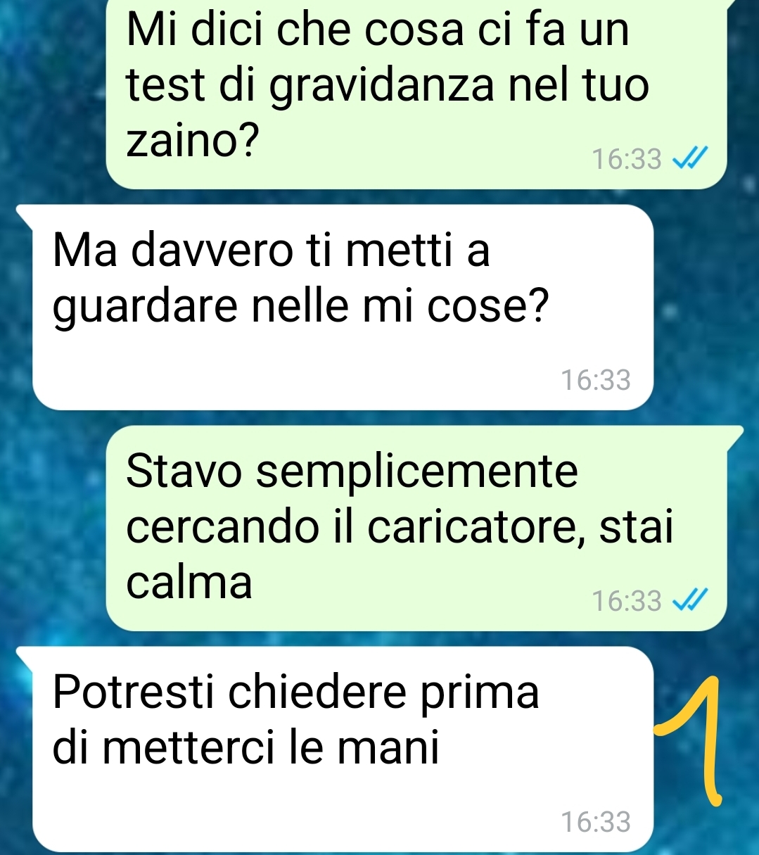 Poi trovo un test di gravidanza nel suo zaino. Non usato e ovviamente nessuna spiegazione. Quindi glielo chiedo ma ovviamente dice che non è nulla.