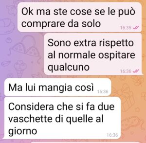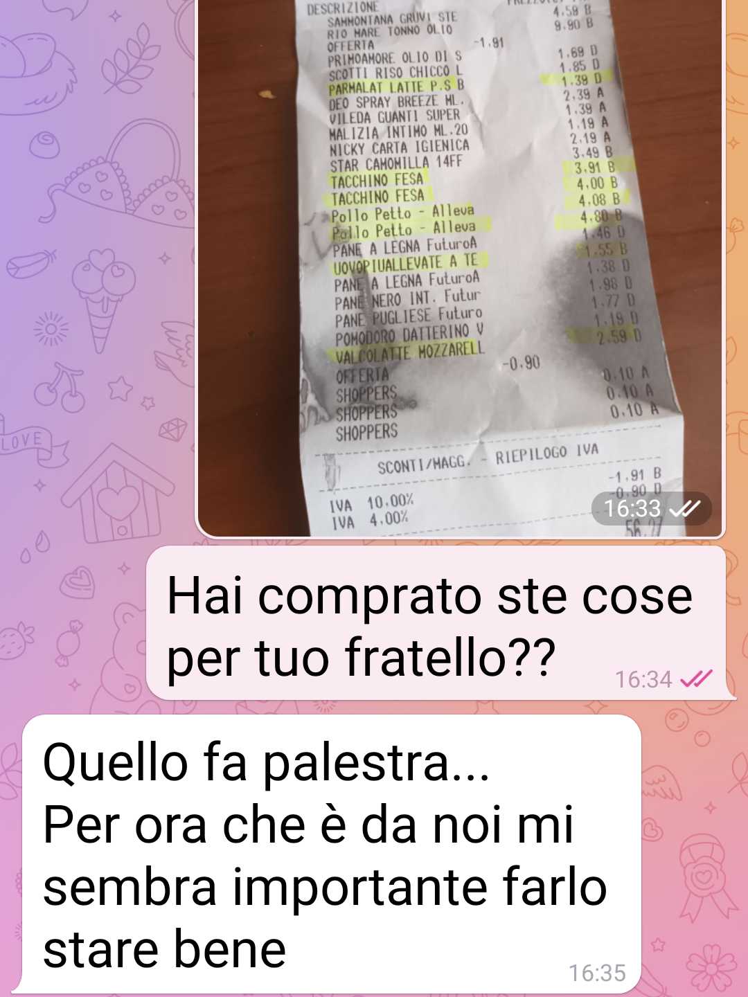 Questo animale di un metro e novanta mangia come un maiale. Lui fa palestra e quindi le proteine gli devono uscire dal cu**. Ok, bello. Ca** suoi. Ma io pago. Io qua mando avanti la baracca. Questa è casa mia. quello si è collocato qui e gli pare di avere trovato l america, la sorellina che lo accudisce come fosse sua madre e il cognato fesso che lo campa. E no, no , non ci siamo capiti proprio. Qua ognuno fa la sua parte. Qua ci si sbraccia le maniche tutti. Oppure…