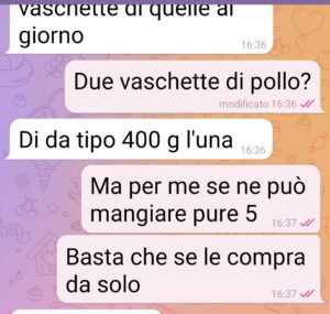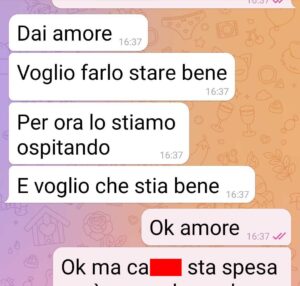 vi mando la conversazione con mia moglie. Mi dispiace ma questo discorso coinvolge anche lei. Vi mando la chat perché nessuno si deve buttare via, ci mancherebbe, vengo da una famiglia di persone che hanno sempre aperto la porta a chi ha avuto bisogno e io non sarò da meno. Ma ….”