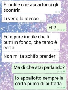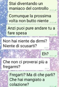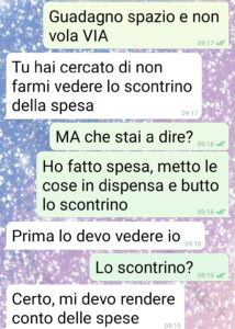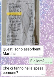 Io sono Martina gente di spunte blu. E questo che trovate negli screen è ciò che è successo con Marco. È il mio compagno da 2 anni dopo 5 di fidanzamento e mai nessun problema tra noi. Tanto che a marzo abbiamo deciso di comprare casa. L’abbiamo ovviamente cointestata e la paghiamo a metà. E per questioni di burocrazia ma anche di garanzie reciproche, che sul matrimonio come istituzione non ci crediamo, abbiamo instituito un conto corrente comune. Lo alimentiamo entrambi con la stessa cifra al mese e da lì paghiamo tutte le spese comuni, bollette, spesa, cene farmacia ecc… e ovviamente il mutuo. L’idea è stata mia, mi sembra la cosa più equa e giusta, dato che entrambi lavoriamo. Infatti l’ha accolta subito e bene. Però è diventato un sindacalista! E oggi mi pianta questo casino per 4 euro scarsi di assorbenti. Per lui non vanno nelle spese comuni. Bruttissimo avere ripensamenti adesso…”