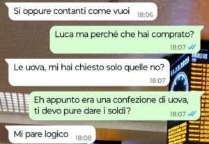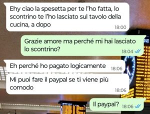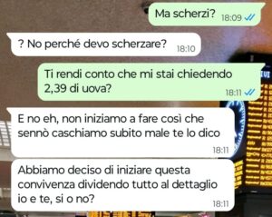 “Ciao care Spunte Blu, non so da dove iniziare ma vi dico subito che oggi ho deciso di mettere un punto alla mia relazione e la cosa incredibile è che io e lui siamo andati a convivere praticamente da pochissimo. Il mio ragazzo si chiama Luca ed è sempre stato molto molto attento alle sue finanze, molto pignolo devo dire, tanto che in due anni e mezzo di relazione immaginatevi che io e lui abbiamo sempre diviso tutto, dalla cena al ristorante all’aperitivo al bar per dire. A me stava e starebbe bene così attenzione, però anche in questi casi c’è un limite a tutto e direi che stasera Luca ha superato ogni limite possibile. Vi lascio leggere che tipo di discussione abbiamo avuto poco fa su Whatsapp e tutto è nato da un piccolo favore che gli ho chiesto io… una misera richiesta che si è trasformata in una valanga perché così non si fa e quando è troppo è troppo anche per me… ditemi che condividete il mio pensiero e sopratutto che non sono una matta o che magari ha pure ragione lui in tutto ciò…”