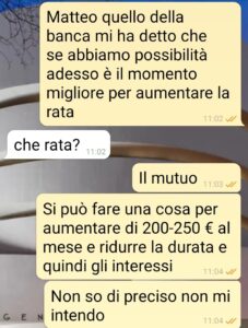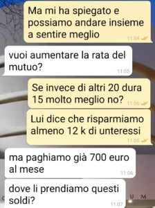 “Un saluto poco festoso a tutti voi amici di spunte. Ho sposato Matteo 6 nel 2018, e subito dopo abbiamo comprato casa con un mutuo cointestato. Lui ha insistito per avere una rata più alta ma una durata inferiore, che così ci sono meno interessi da pagare. Oggi c’è la possibilità di aumentare la rata e diminuire ancora la durata. Ottimo mi dico. Possiamo farlo, che il mio adorato marito ha iniziato a fare straordinari, molti straordinari, da due mesi e continuerà a farli. Mi ero commossa quando me lo disse, una tale dedizione a noi, alla coppia, a me! Tutto per mettere “fieno in cascina” per noi. Ho cercato di fare la mia parte anche io, nel modo che potevo, ovvero sollevarlo da qualsiasi altro impegno familiare. Ora però mi dice che non possiamo, che non abbiamo 200 miseri euro in più al mese. Con 80 ore di straordinario al mese??? Ed ecco che viene a galla la verità. Tremenda. Bugiardo e fannullone.”