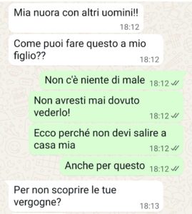 Non sono mai stata una santa, ma chi lo è?? Sono una donna come tutte. Casa mia è un luogo privato, dove si fanno cose che nessuno dovrebbe vedere. Lo sapete tutti, non sto a dire niente di nuovo. Ci sono cose che nessuno dovrebbe vedere. Ma mia suocera non si fa assolutamente i fatti suoi e si permette di salire a casa mia quando non ci sono senza chiedermi prima se può o meno. Così, le viene in mente e sale, e apre la porta di casa mia e si mette a pulire e a spostare soprammobili e a cercare a frugare negli armadi e nei cassetti.