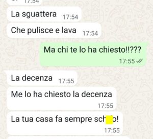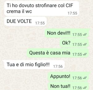 Lei ha le doppie chiavi e quando non ci sono senza il mio permesso entra e fa le pulizie. Ma non solo. Mi sposta tutto come piace a lei e controlla. Il suo non è un fare del bene ma è un controllare anche, controllare che tutto sia apposto come dice lei.