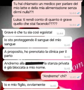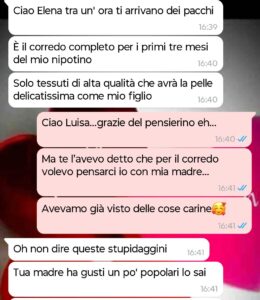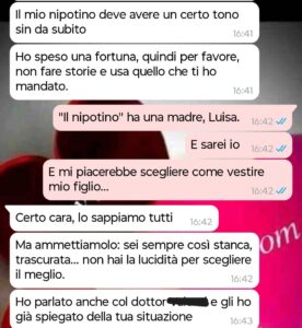 “Ciao a tutti. Mi chiamo Elena, sono al settimo mese di gravidanza e, teoricamente, questo dovrebbe essere il periodo più dolce, emozionante e radioso della mia intera esistenza. Tutti mi avevano assicurato che avrei vissuto in una bolla di pura gioia, tra i primi calcetti nella pancia, la scelta della culla e i sogni ad occhi aperti sul futuro. Invece, mi ritrovo prigioniera di un incubo quotidiano che ha un nome e un cognome ben precisi: Luisa, mia suocera. Quella che all’inizio sembrava una donna solo un po’ troppo premurosa, si è rivelata col tempo una presenza asfissiante, manipolatrice e profondamente tossica. Da quando ha scoperto che porto in grembo un maschio, la situazione è degenerata oltre ogni limite immaginabile: ha perso completamente il contatto con la realtà e con il rispetto basilare verso di me. Ai suoi occhi, io ho smesso di essere una persona dotata di sentimenti, desideri e volontà; per lei sono diventata un semplice contenitore, un tramite biologico necessario per la venuta al mondo di quello che definisce ossessivamente il suo erede. La sua invadenza è diventata una forma di stalking psicologico: mi tempesta di messaggi a ogni ora del giorno e della notte, pretende di monitorare minuziosamente la mia dieta e ha già deciso unilateralmente ogni dettaglio del futuro di mio figlio come se io non esistessi. Mi sento letteralmente derubata della mia stessa maternità. L’ultima chat che abbiamo avuto è stata la goccia che ha fatto traboccare il vaso. Io e mio marito siamo ancora scossi… davvero può arrivare fino a questo punto nel suo delirio in cui crede fermamente di essere la vera madre di un bambino che non è suo?”