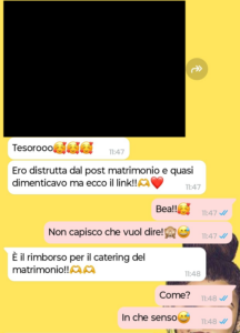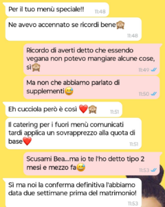 “Ciao a tutti! Mi chiamo Valeria e poco tempo fa la mia amica Beatrice si è sposata e…ancora non ho capito esattamente cosa sia successo. Il matrimonio è stato bellissimo, una cornice da favola, ma la sua recente richiesta mi ha fatto chiedere se oltre ad avere un anello al dito, non sia anche cambiata completamente dato che sembra che più che un’amicizia, io sia una voce di bilancio da far quadrare a tutti i costi. Io sono vegana da quasi dieci anni: non è una moda, è una scelta di vita che tutti i miei amici conoscono e rispettano. Quando è arrivato l’invito, tre mesi fa, la prima cosa che ho fatto è stata avvisare Beatrice per non crearle problemi col catering. Lei mi ha risposto con cuoricini e rassicurazioni, dicendo che ovviamente ci avrebbero pensato loro. Mi sentivo tranquilla, ho persino fatto un regalo molto generoso, una busta che copriva ampiamente la mia presenza, convinta che il nostro legame valesse ogni sacrificio fatto per esserci. Poi, invece della foto del taglio della torta o di un ringraziamento, ricevo una notifica: un link di pagamento. Beatrice pretende che io le rimborsi un supplemento perché, a suo dire, il mio capriccio alimentare ha costretto lo chef a un lavoro extra che il ristorante le ha fatturato a parte. Ma la cosa che mi manda fuori di testa, oltre alla richiesta economica in sé, è la spocchia con cui descrive il pasto che ho consumato. Secondo lei ho avuto un trattamento da regina con un menù gourmet creato ad hoc, mentre posso assicurarvi che quando faccio la spesa di fretta mi tratto decisamente meglio. La sua cattiveria e il suo senso di superiorità sono arrivati a un livello tale che non potevo stare zitta. Leggete questa chat e ditemi se è normale trattare così un’amica dopo che ha celebrato con te il giorno più importante della tua vita”