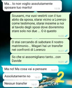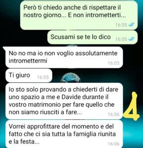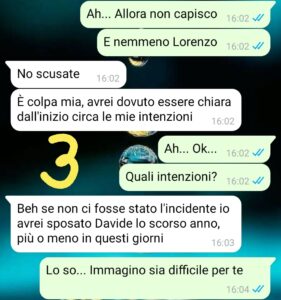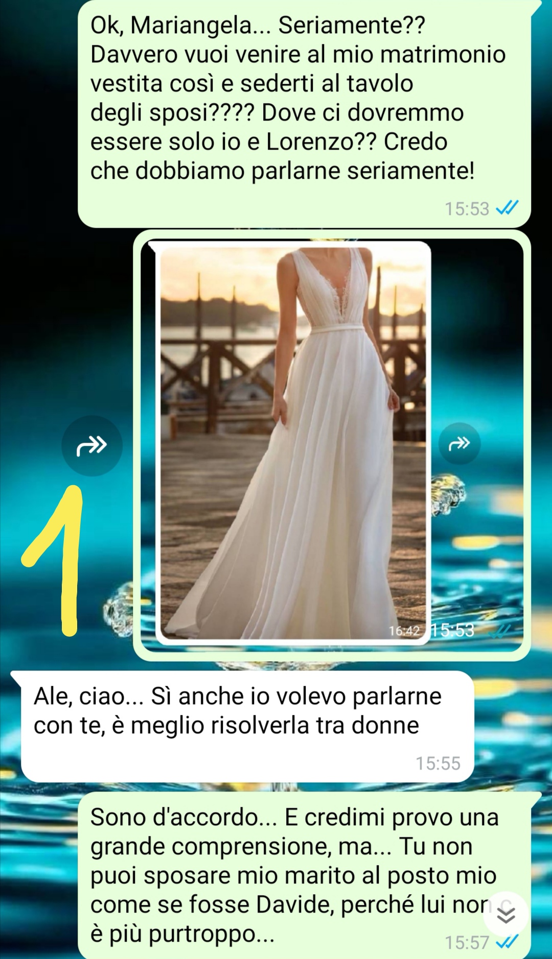 Come vi dicevo purtroppo Davide, il fratello di mio marito, è morto 6 mesi prima delle nozze, un anno e mezzo fa. Davide avrebbe dovuto fare da testimone a Lorenzo, mio futuro marito… ma purtroppo un tragico destino ha scelto diversamente. Così Lorenzo ha chiesto a Mariangela, la donna che Davide avrebbe dovuto sposare, di essere la sua testimone facendo le veci del fratello. Anzi è lei che ha insistito… quindi lei voleva fare da testimone e stare al fianco del mio futuro marito durante la cerimonia e poi voleva sedersi con noi al tavolo degli sposi…e se questo non fosse stato già decisamente troppo, beh, ci ha pensato l’abito che avrebbe voluto indossare… un abito da sposa! Lo stesso che non ha potuto indossare il giorno del suo purtroppo mancato matrimonio. Così dato che il non futuro marito sembra non capire decido di scriverle direttamente io…e non avete la minima idea di cosa sia successo. Vi lascio tutti gli screen.